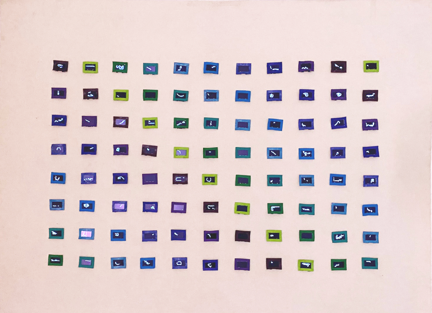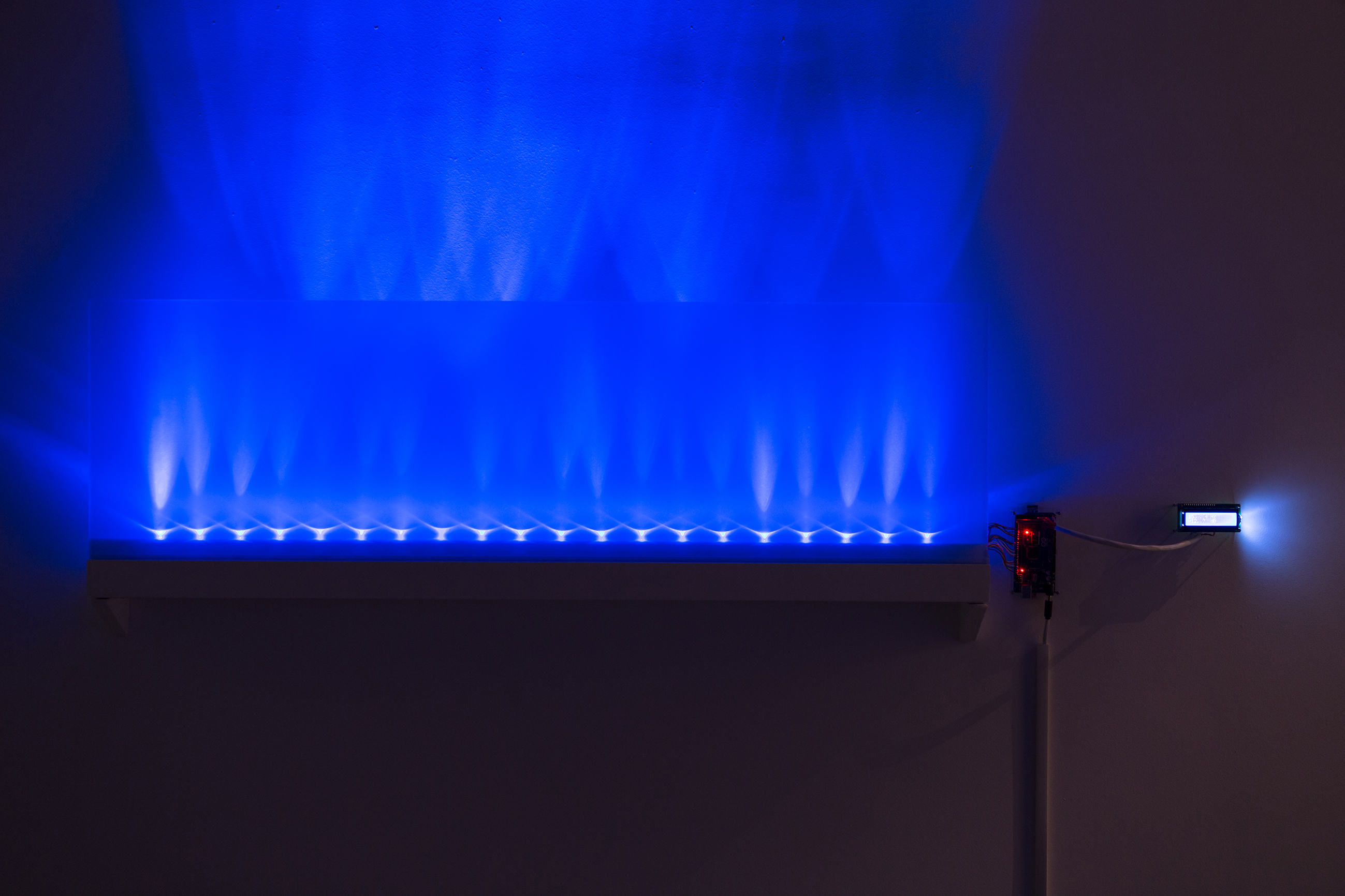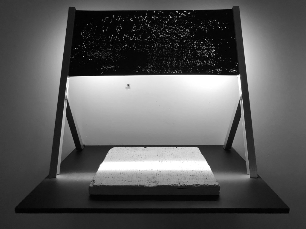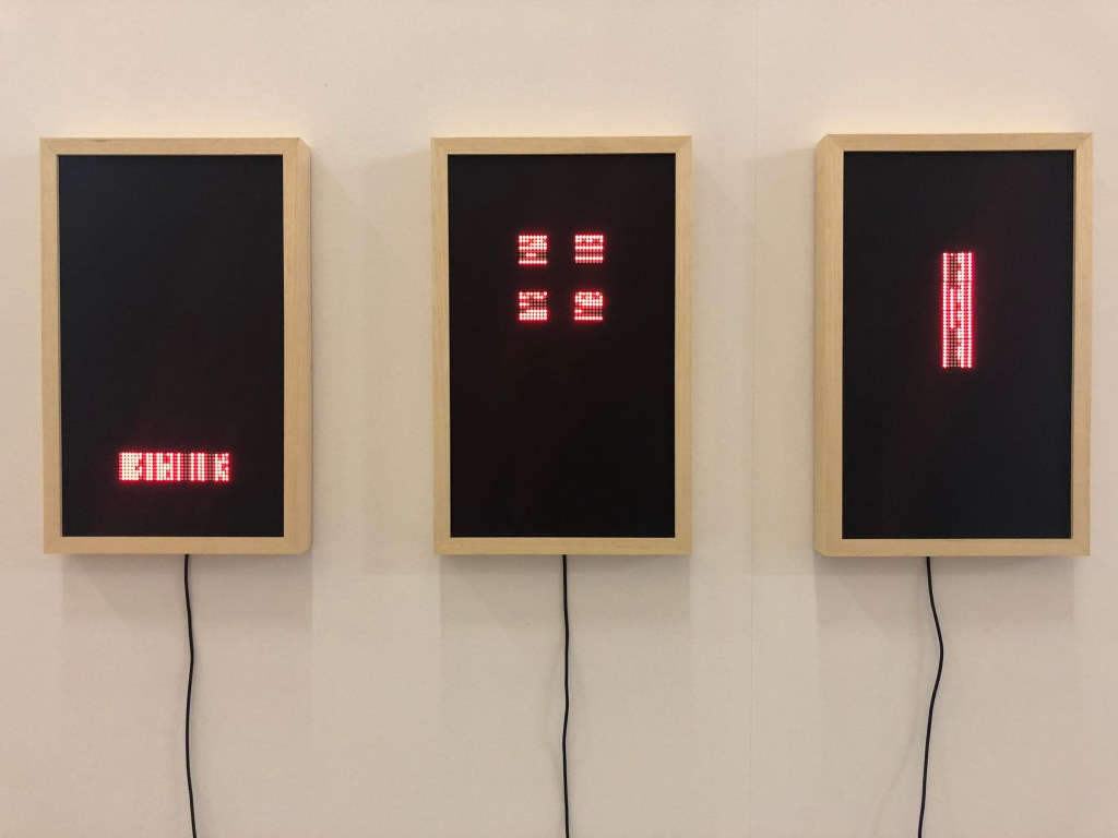 En una nueva traducción entre lenguajes, Diego Alberti desarrolla un dispositivo lumínico que genera patrones visuales en base a este código; conformado a partir de caracteres cuyas combinaciones parecen infinitas pero no lo son, ya que se encuentra limitado a un cierto rango de valores. Cambiar una letra no implica sólo cambiar una nota, sino modificar la melodía, sin conocer por completo de manera previa el efecto derivado. Esa escritura básica, arbitraria, inventada por nuestra civilización, da paso ahora en su simpleza a expresiones múltiples, habilitando campos que paradójicamente implican ceder el control.
