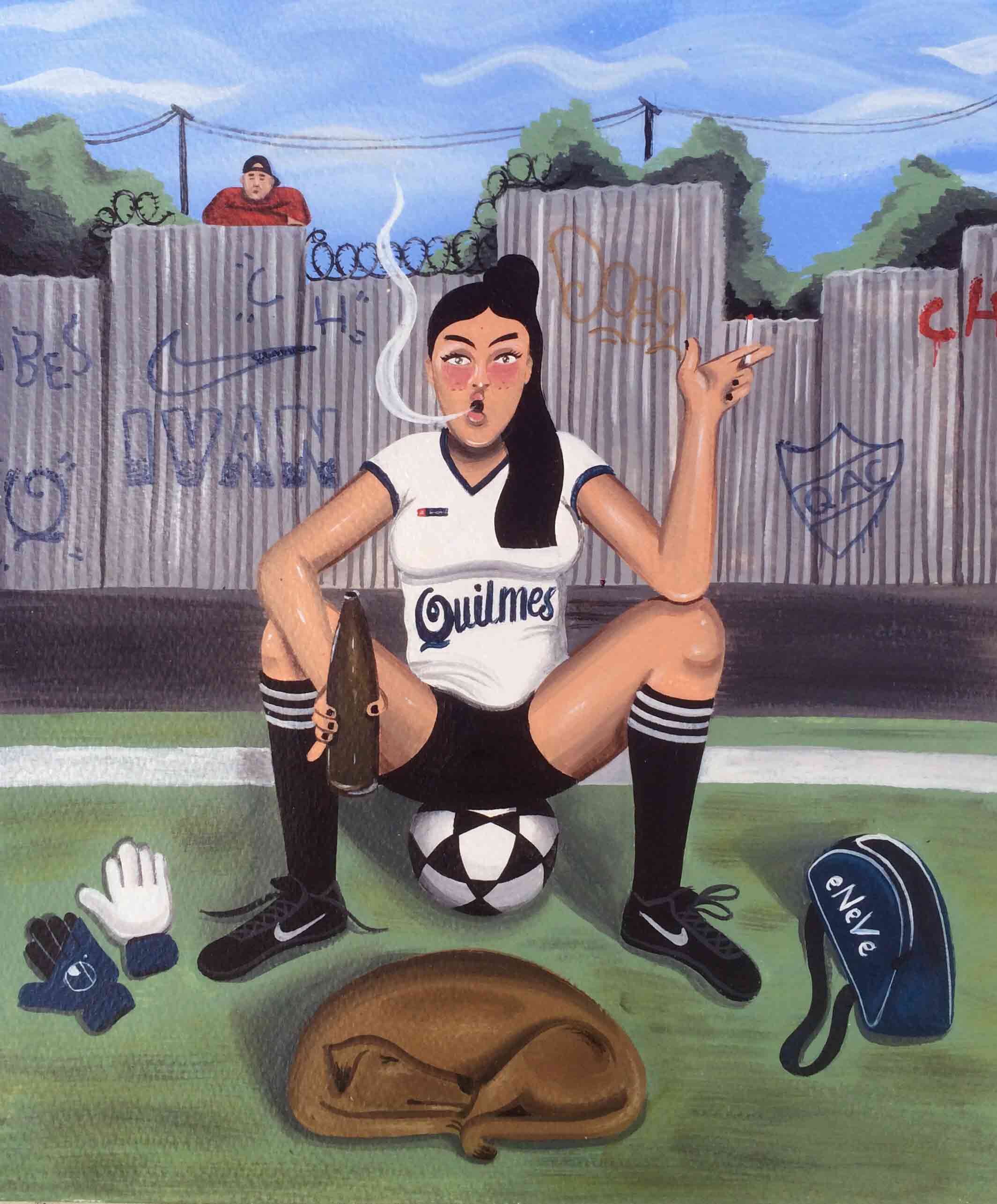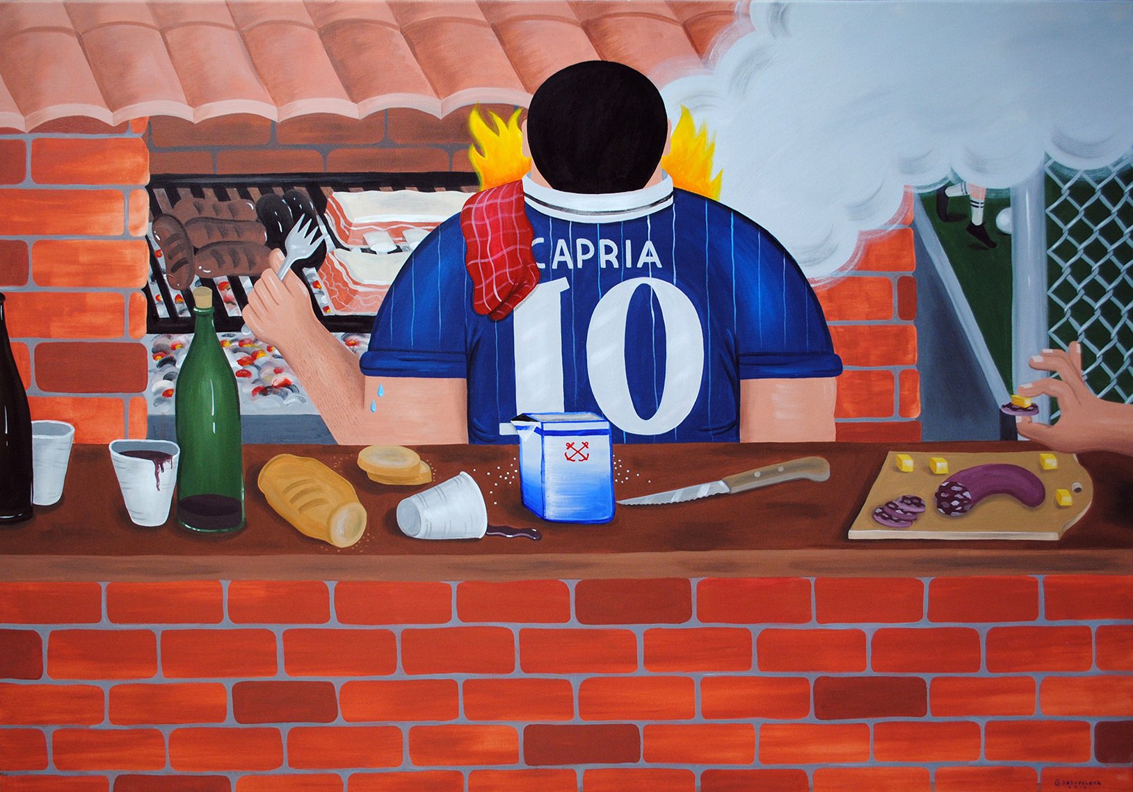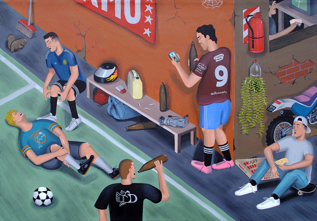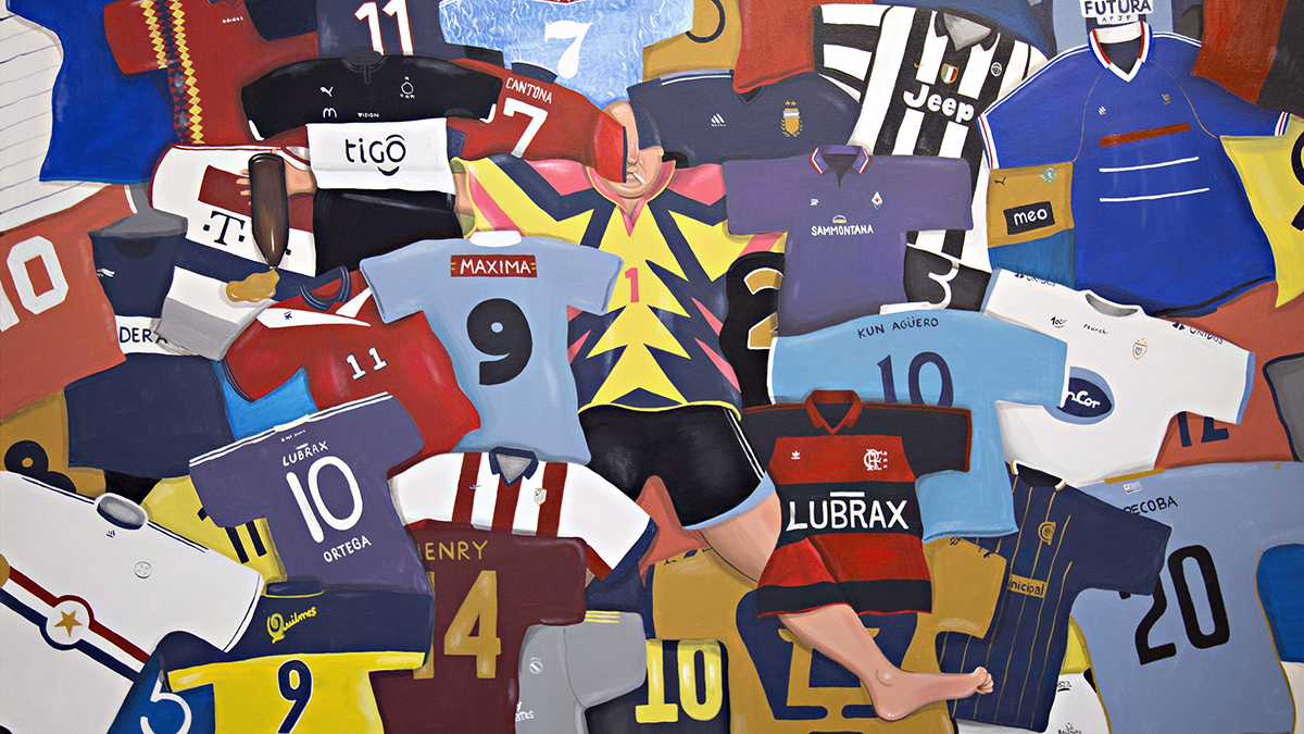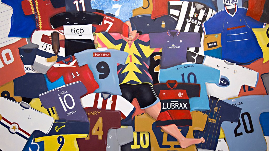 En sus pinturas, las camisetas de Riquelme, el Burrito Ortega y el Kun Agüero, con alfajores, palmeritas, empanadas, cigarrillos, botellas de cerveza y otras cosas poco saludables para un deportista que se precie.
