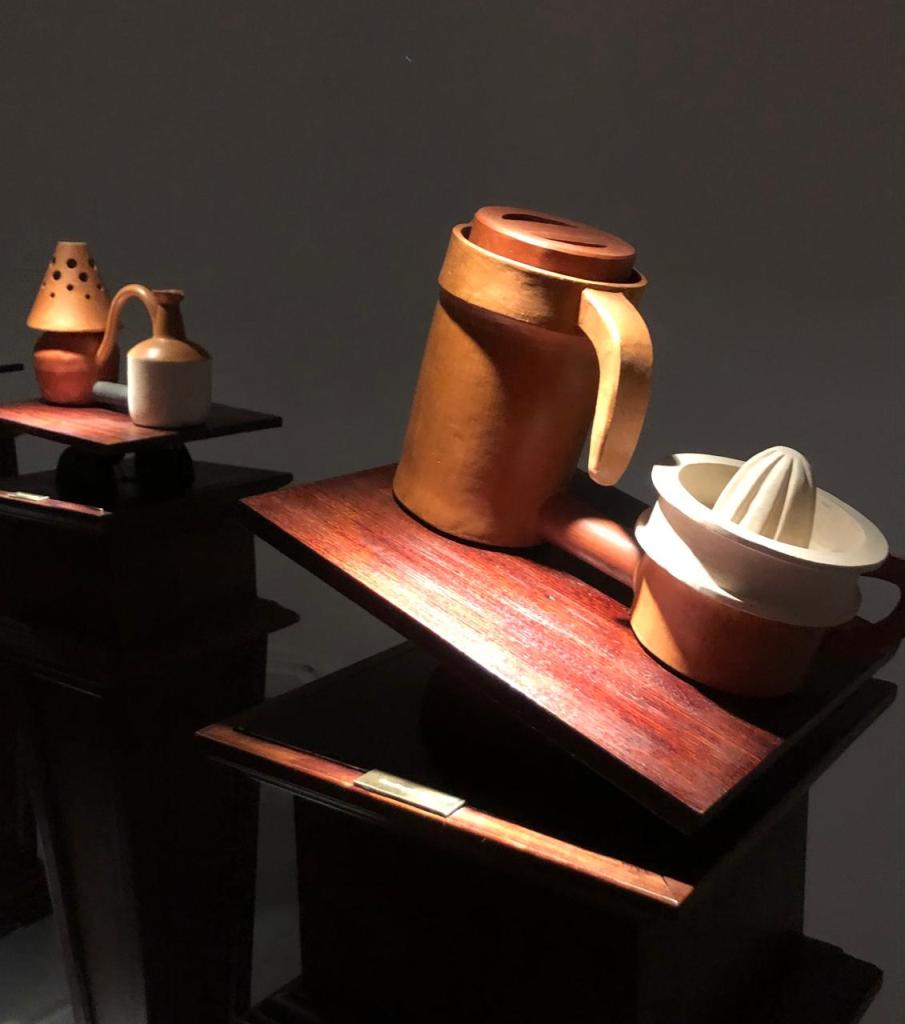 Cuesta percibir, recién ingresando a la sala, que las piezas que componen la muestra están construidas enteramente en cerámica, por lo realista que resultan algunas de ellas. Encontramos una serie de tótems de madera tallada que sostienen unos dispositivos cuyo movimiento varía constantemente.