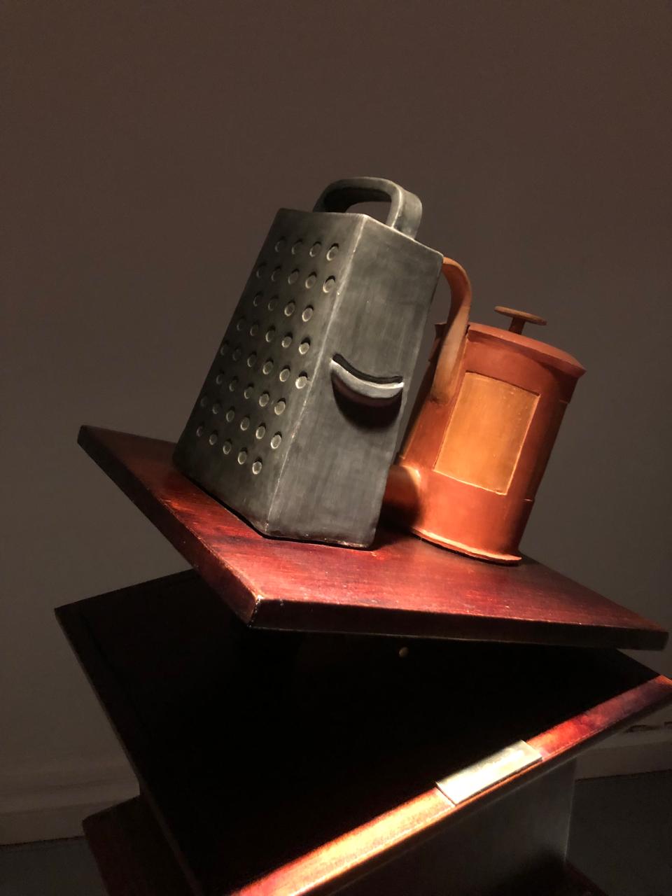 Cuesta percibir, recién ingresando a la sala, que las piezas que componen la muestra están construidas enteramente en cerámica, por lo realista que resultan algunas de ellas. Encontramos una serie de tótems de madera tallada que sostienen unos dispositivos cuyo movimiento varía constantemente.