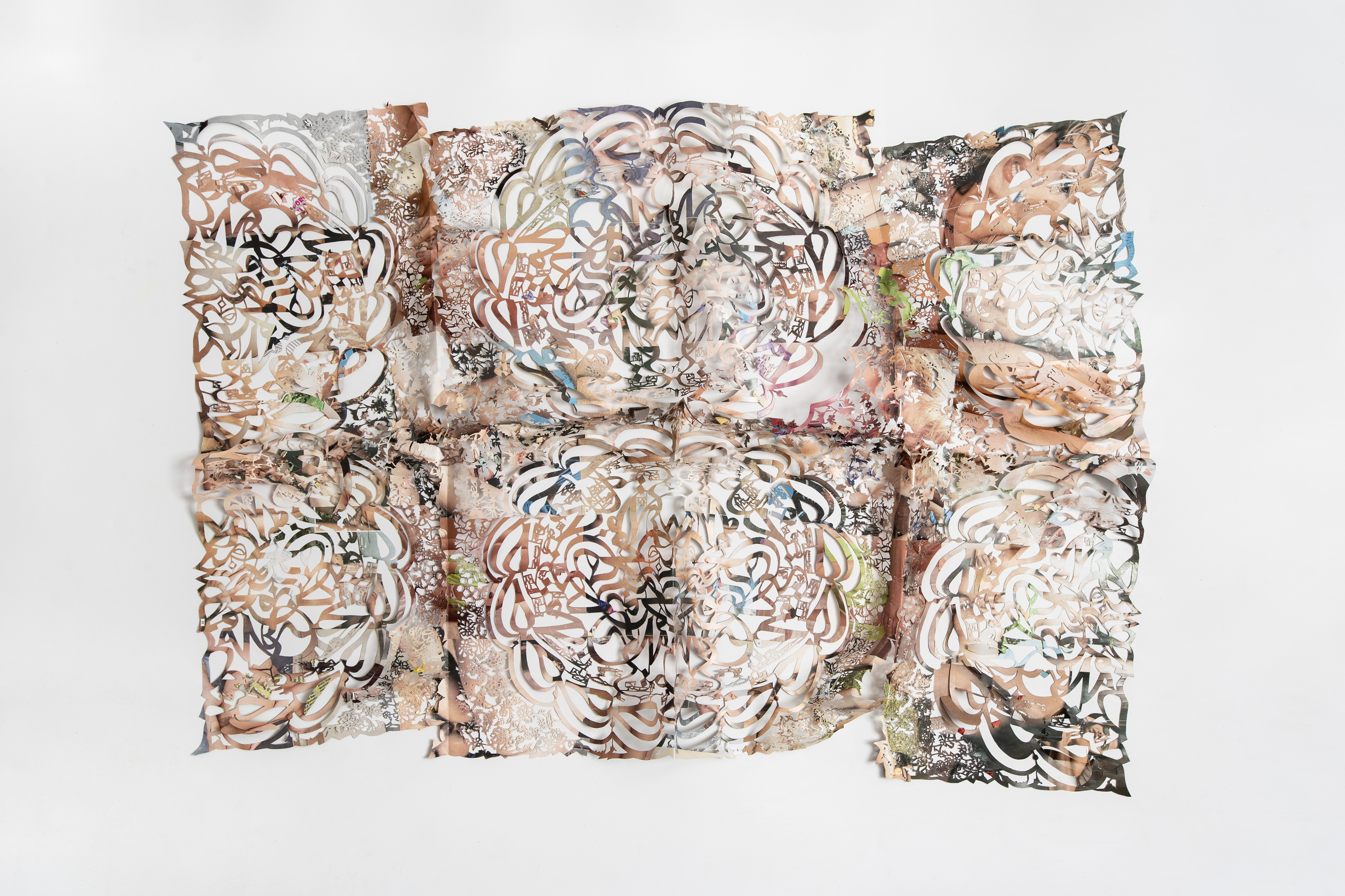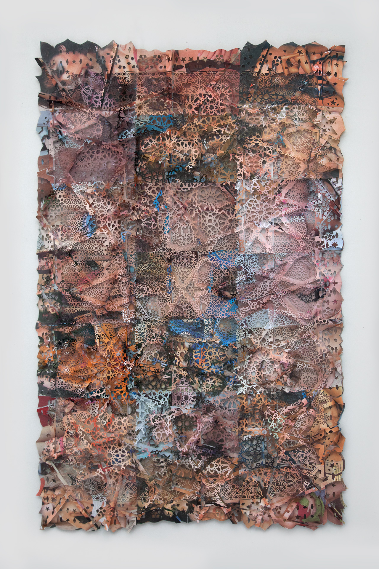 ESM-Tenés una destreza impresionante con el calado y empezaste a incursionar en la geometría islámica. Durante muchos años en los países islámicos más ortodoxos, los artistas no tenían permitido trabajar con la figura humana y se volvieron muy hábiles con patrones geométricos únicos, muy elaborados. Vos te apropias de estos trazados, llevándolos al calado, pero superponiéndolos a estas imágenes más polémicas.