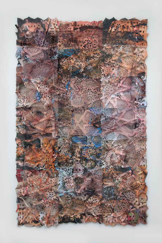 Son páginas o posters pegados uno al lado del otro para hacer una hoja grande. El trabajo del calado está hecho a través del plegado de esas mismas, se pliegan las imágenes en 6, 7 partes y a través de un bisturí voy perforando, guiándome por las formas del diseño que elijo en cada caso.