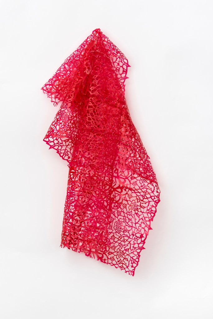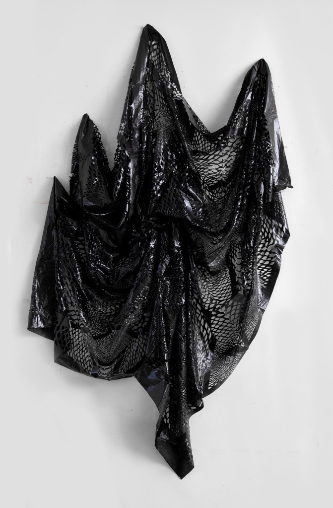 IE- Es el agotamiento no del recurso, pero sí de este afán de encontrarle la vuelta y llegas a un punto en el que sentís que tocaste un límite. Empecé a hacer este tipo de obras para exaltar más la trama fina. Este trabajo preciosista, más que ver con una Burka, se llama Burka fantasma. son materiales plásticos para hacer bolsas y seguí con este material, el polímero sintético, hasta llegar a un material mucho más grueso, de 200 micrones, que se utiliza para aislamientos en construcciones