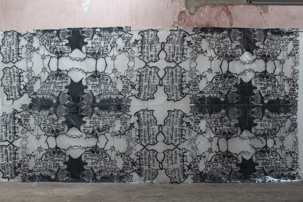 A través de la investigación que hice sobre una familiar que escribió un libro, lo primero fue ir a pasear al cementerio y me llamó mucho la atención los grabados sobre las lápidas, las formas que tenían. Decidí tomar algunos motivos de diseños decorativos de algunas lápidas para generar este patrón para calar, hay estrellas de David que se ven, laureles, tipografías hebreas, el candelabro, hay un rosetón. Iba con hojas de papel y hacía un frottage sobre la lápida para levantar el relieve.